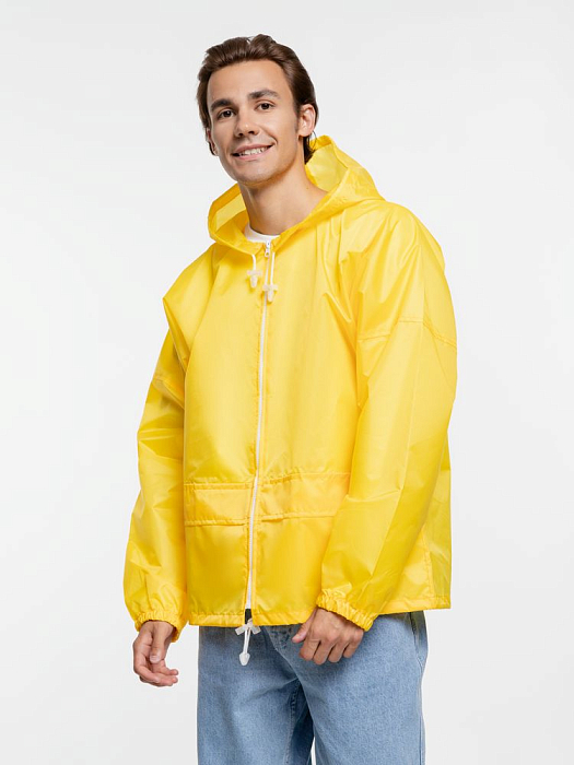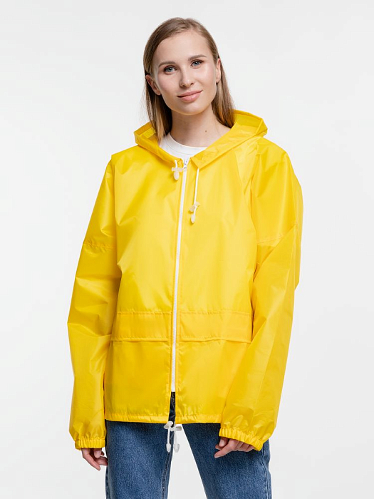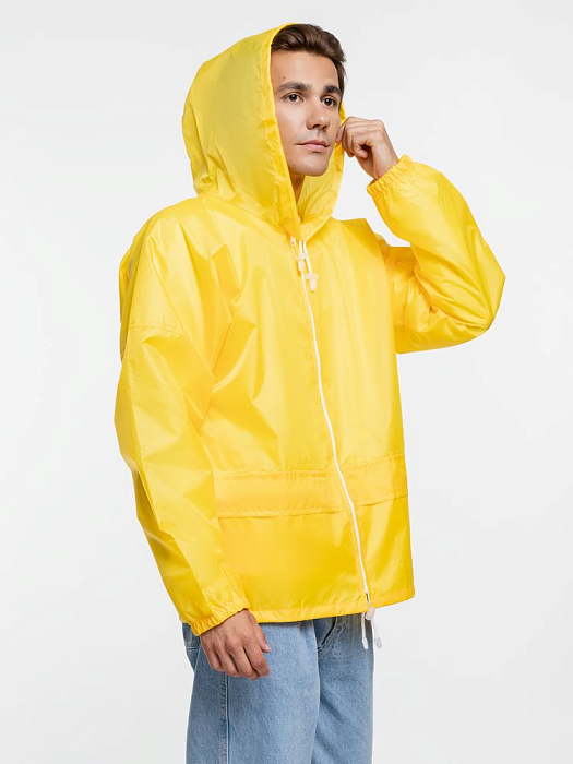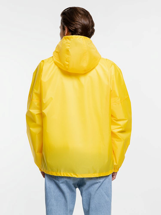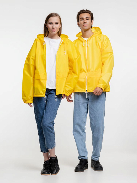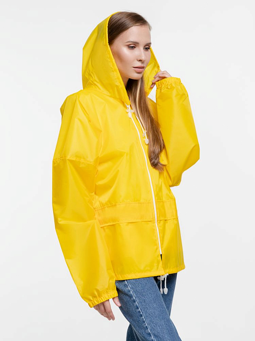 Укороченный дождевик свободного кроя из ткани таффета с влагозащитным покрытием. Складывается в мешочек — удобно брать с собой.