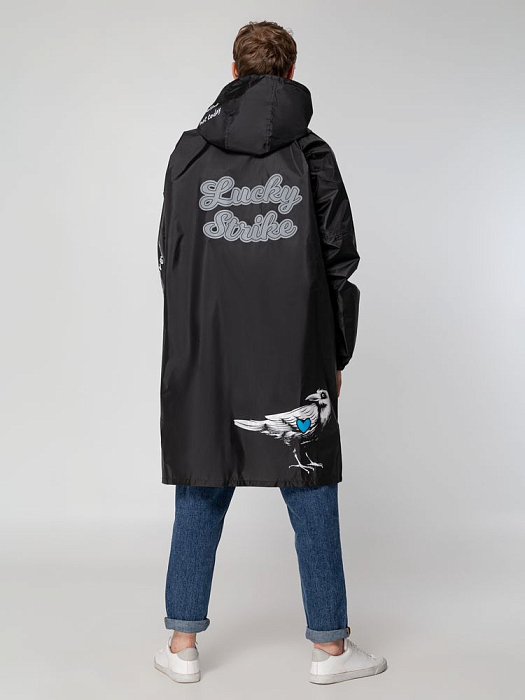 Плащ-дождевик из ткани таффета на молнии с капюшоном. Складывается в мешочек — удобно брать с собой.