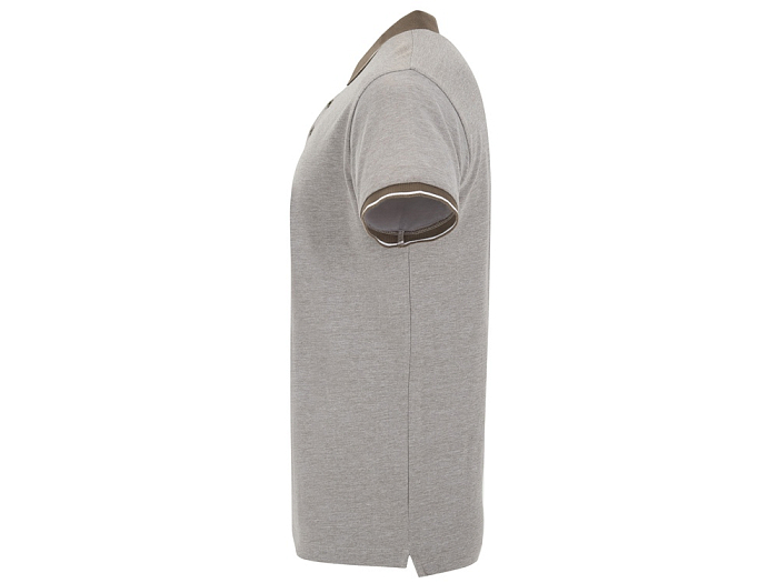 Рубашка поло с коротким рукавом. Манжеты и воротник из однотонного риба 1х1 с контрастными полосками. Планка на 3 пуговицы. Низ с боковыми разрезами, отделанными тесьмой. Спинка немного длиннее полочки. Полотно с меланжевым эффектом.