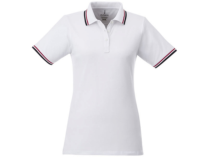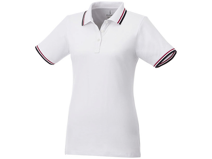 Женская футболка поло Fairfield с коротким рукавом с проклейкой. Воротник гладкой вязкой в рубчик. Манжеты гладкой вязкой в рубчик. Контрастные окантовки. Планка с тремя пуговицами (мужская модель).Гравированные пуговицы в цвет изделия. Комфортный ярлык-трансфер на изделии. Трикотажное пике, 100% хлопок. 180 г/м².