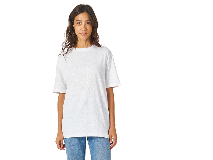 Полотно футболки имеет необычную структуру - с протяжками, но при этом гладкую поверхность, что обеспечивает идеальную поверхность для нанесения: прямая печать, трафаретная или термотрансфер прекрасно ложатся на такое полотно. Декоративная отстрочка по низу рукавов и изделия, а также отстрочка по горловине позволяют футболке дольше сохранять форму.