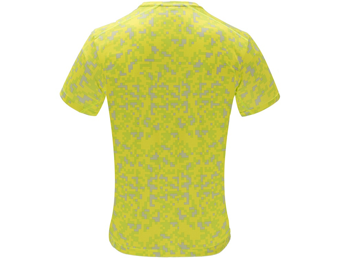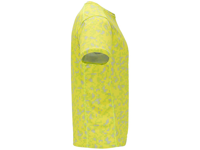 Футболка с принтом и короткими рукавами. Круглая горловина с усиленными закрытыми швами контрастного неоново-желтого цвета. Боковые вставки с внутренней стороны рукавов и на плечах с оверлочными швами в тон.