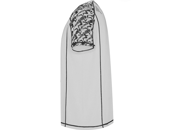 Спортивная футболка с коротким рукавом и принтованными вставками. Контрастные отстрочки плоским швом, светоотражающие элементы на полочке и спинке. Эко лейбл на рукаве.