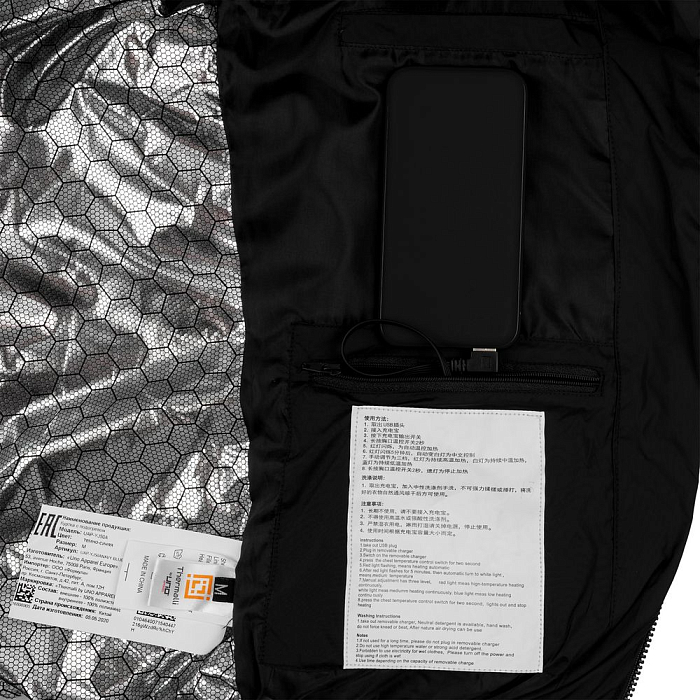 1. Подключите внешний аккумулятор к кабелю во внутреннем кармане куртки.