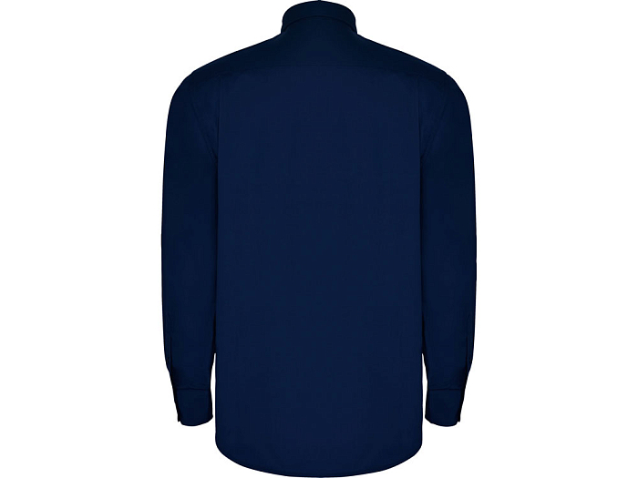 Рубашка мужская с длинным рукавом на семи пуговицах. Накладной карман на груди слева, закругленный низ изделия. Уголки воротника продублированы пуговицами.