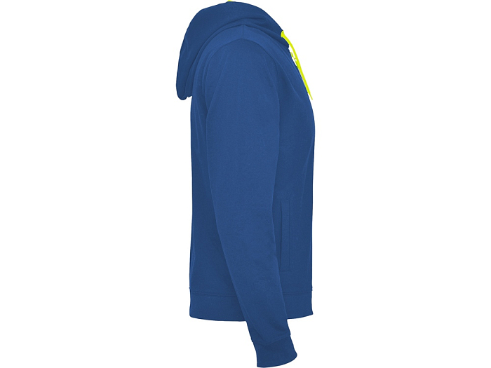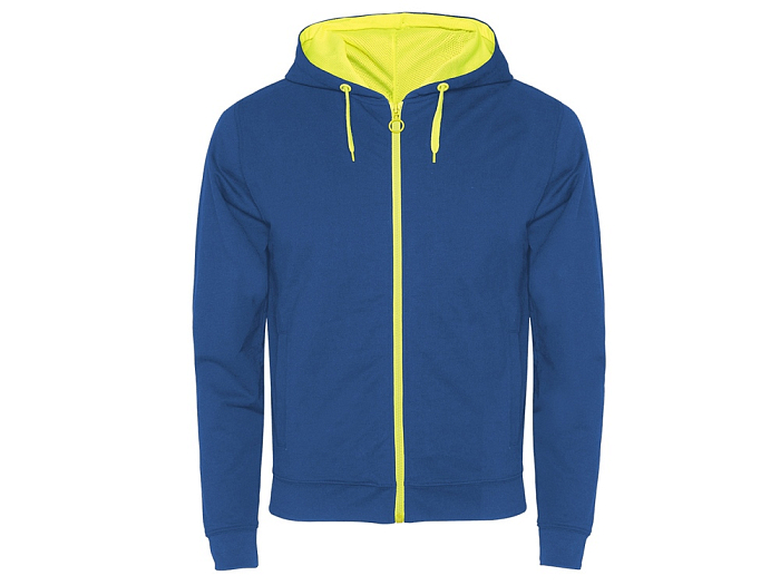 Толстовка на молнии из френч терри без начеса с деталями неонового цвета. Центральная молния с контрастным пуллером. Подкладка капюшона из микроперфорированного полиэстера контрастного неонового цвета. Шнур капюшона и айлетсы контрастного неонового цвета. Риб 1х1 на манжетах и внизу изделия. Два боковых кармана с широкой листочкой. Укрепляющая строчка внутри горловины.