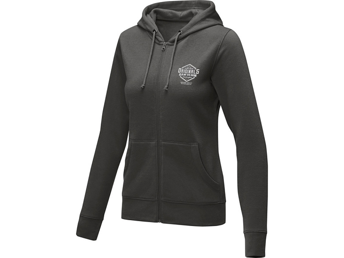 Женская толстовка на молнии Theron. Основная этикетка, которую можно оторвать или отрезать, без неудобных пришитых ярлыков. Завязки на капюшоне. Расположенная по центру молния. Карман «кенгуру». С подшивкой из гладкого трикотажа в рубчик. С манжетами из гладкого трикотажа в рубчик. Внутренняя сторона покрыта ворсом. Тесьма из основного материала по внутренней стороне горловины. Придающие форму швы и зауженная талия для ровного прилегания. Трикотаж 50% Хлопок, 50% Полиэстер, 240 g/m2.
