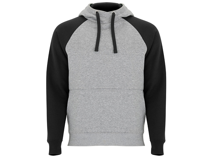 Худи с контрастным рукавом реглан. Капюшон с запахом, с контрастной подкладкой и шнурком. На полочке карман кенгуру. Манжеты рукавов и низ изделия из риба 1х1.