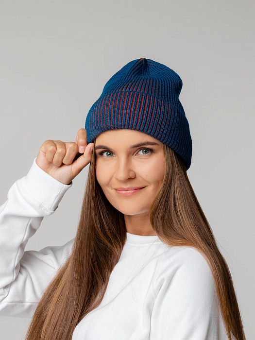 Удлиненная двухцветная шапка из полушерстяной пряжи идеально подходит для создания яркого и современного городского образа и будет удачно смотреться с верхней одеждой разных стилей.