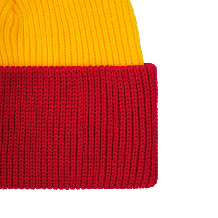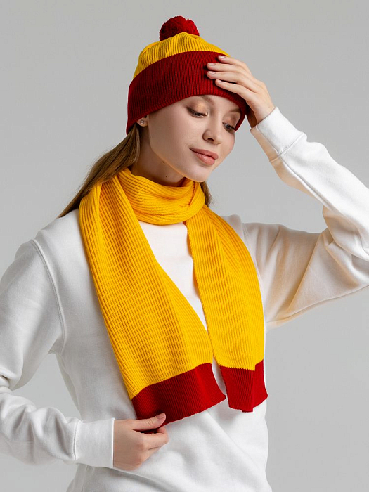 Двуслойная шапка фактурной вязки с контрастным подворотом и помпоном.