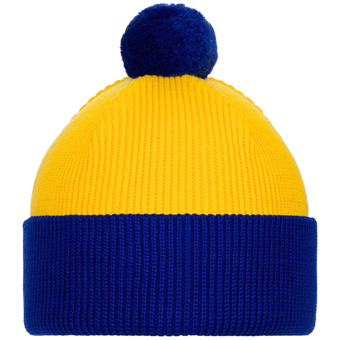 Двуслойная шапка фактурной вязки с контрастным подворотом и помпоном.