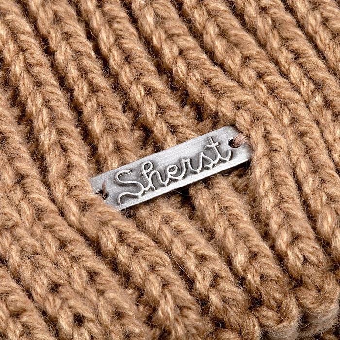 Металлический шильд с названием бренда расположен у заднего шва шапки. Это оставляет место спереди для пришива лейбла или шильдика с логотипом заказчика.