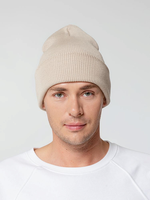 Двухслойная шапка, связанная резинкой, с широким отворотом.