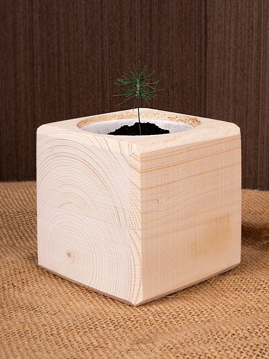 В наборе: деревянный куб, грунт, семена голубой ели.