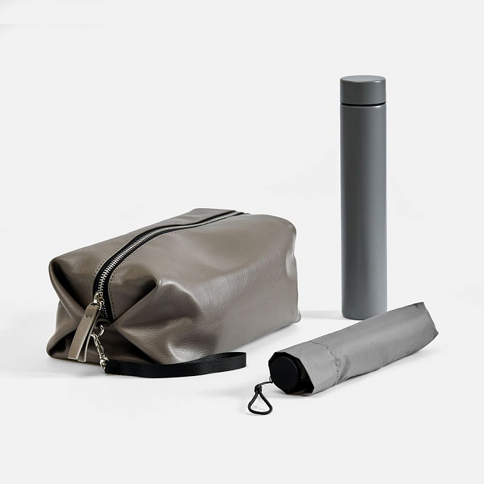 • Размеры несессер: 22х12х12 см, в сложении 23х14х4 см; зонт: длина 49 см, диаметр купола 90 см, длина в сложении 22 см; термобутылка: диаметр 4,3 см, высота 23,5 см