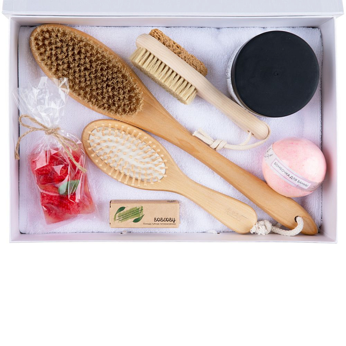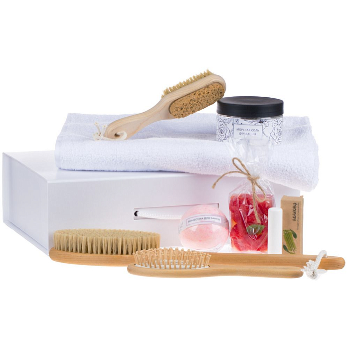 Набор Royal Retreat — роскошный и вдохновляющий набор, который поможет провести настоящий SPA-ритуал не выходя из дома. В нем есть все, что нужно для получения исключительно приятных ощущений: массажные щетки для тела и стоп, ароматные соль и бомбочка для ванны, нежное мыло, питательная помада и мягкое полотенце.