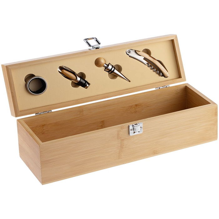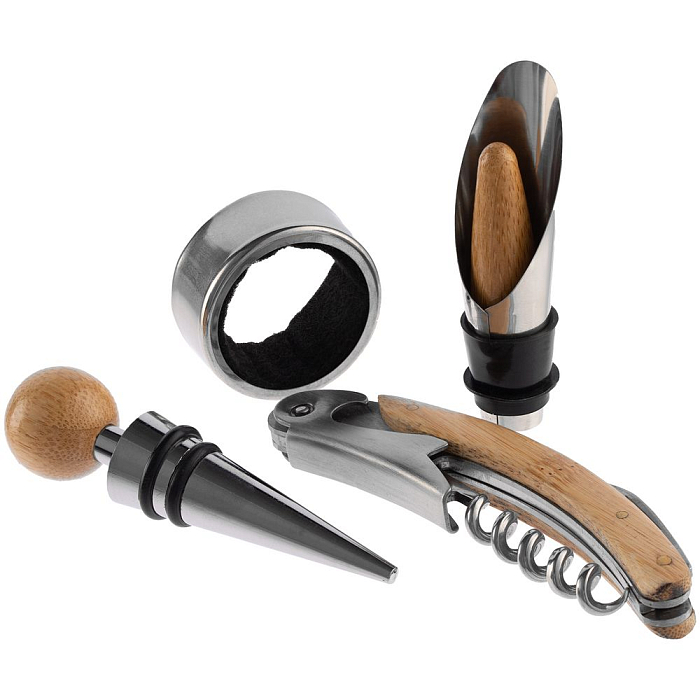 Набор для вина Vinotech с футляром для бутылки — оригинальный и функциональный подарок. Штопор поможет бережно и без усилий откупорить бутылку, а чтобы вино не расплескалось и не оставило пятен, пригодится кольцо-каплеуловитель, надетое на горлышко открытой бутылки: так капли не будут стекать на стол или скатерть. Аэратор поможет аромату вина раскрыться, а винная пробка сохранит свежесть и вкус напитка еще некоторое время после откупоривания бутылки.В наборе: