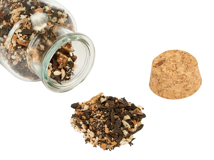 Состав: чай чёрный с имбирём и соком имбиря (чай чёрный байховый крупнолистовой, кусочки имбиря, сок имбиря), медовые гранулы, корица дроблёная.