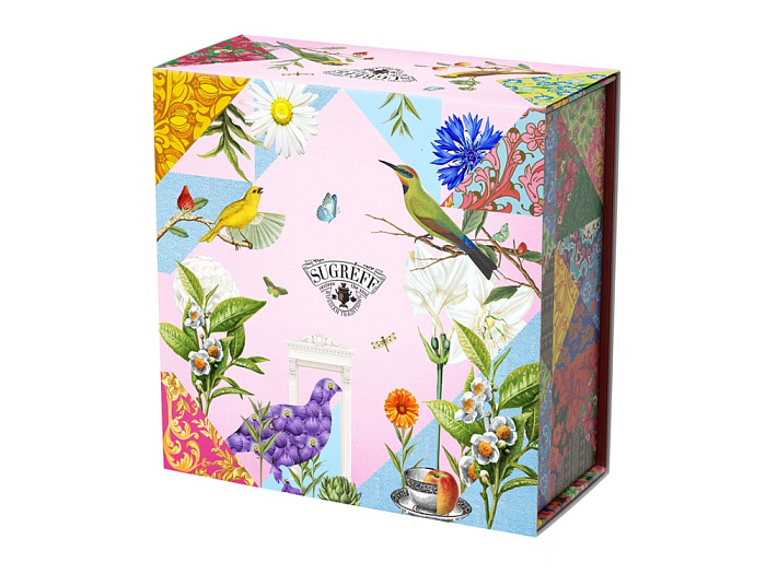Купажи чая составлены так, чтобы сочетать вкус и аромат отборных сортов китайского и индийского чай с красотой разноцветных лепестков мальвы, лилии, жасмина и акации. В набор также входят монпансье со вкусом чёрной смородины и цукаты из кумквата. Внутри шкатулки находится мини-открытка, которую покупатель может подписать.