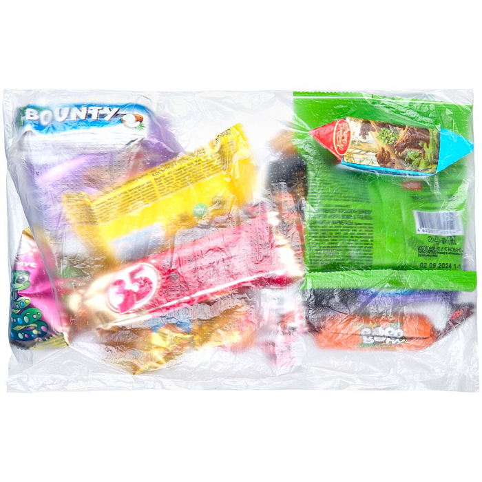 Конфеты упакованы в прозрачный полиэтиленовый пакет.