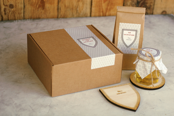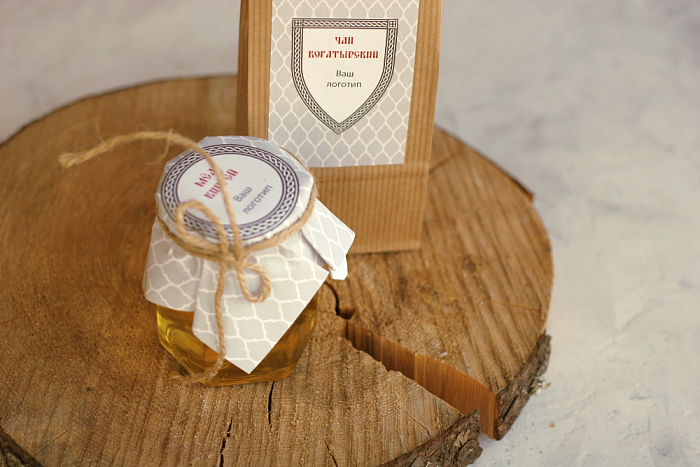 • Брендирование На всех печатных элементах набора: наклейка на коробку, обечайка на мед, наклейка на чай.