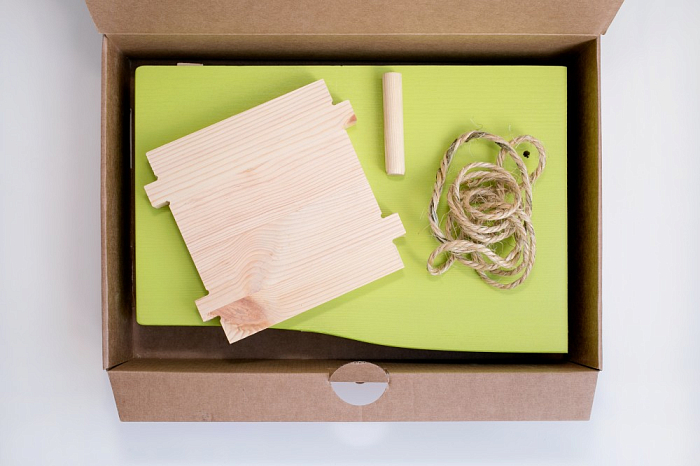 Скворечник в этом подарке собирается без помощи гвоздей и клея, современной формы с цветной крышей. При чем цвет крыши может быть другой - в корпоративном цвете Вашей компании.