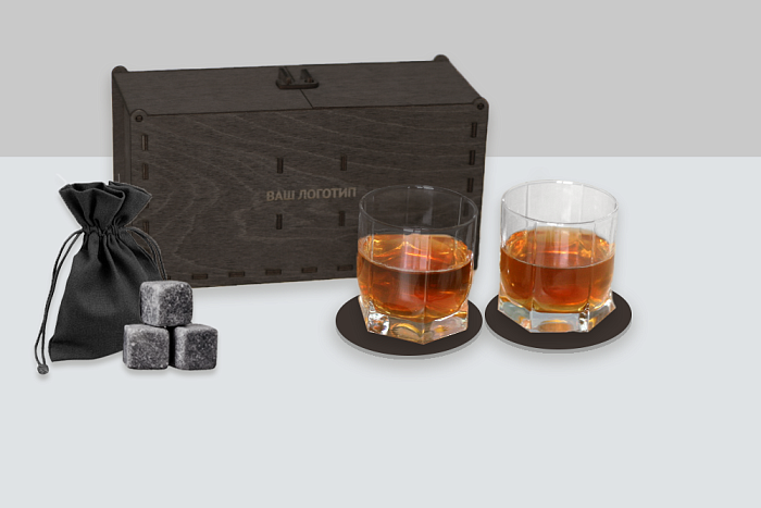 Этот подарок подойдет для транспортировки в другие города России - удобные перегородки фиксируют бокалы, а для костеров и камней для виски придумано специальное отделение в шкатулке.