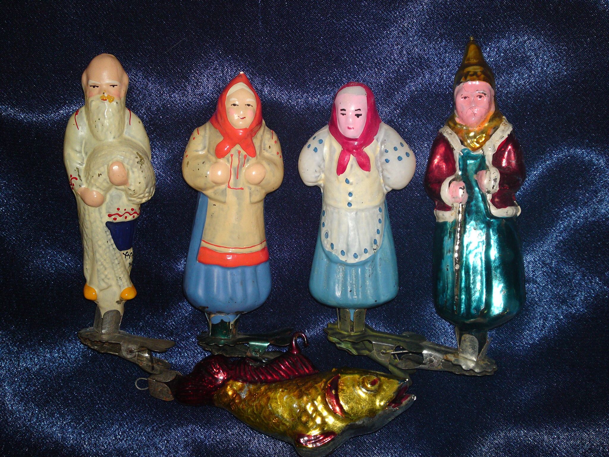«Сказку о рыбаке и рыбке» представляют на ёлке золотая рыбка, старик с неводом и старуха в трёх образах (держит руки перед собой, руки в боки и в образе столбовой дворянки).